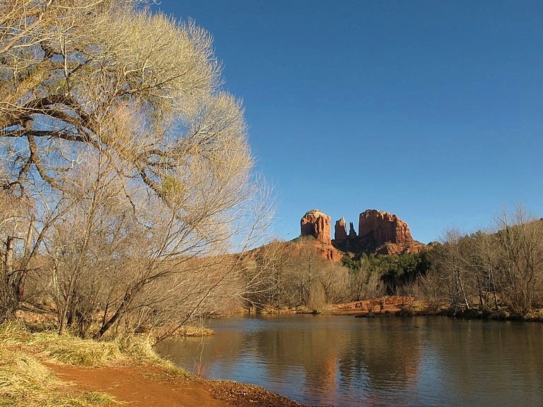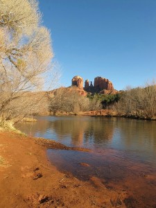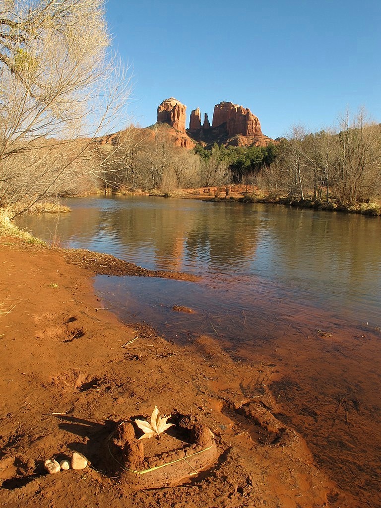 Sunday, January 23 – We took a drive to both sides of Red Rock Crossing. There is no bridge, so we had to drive all the way to west Sedona from the village where we live. From what I have been told, this is one of the most photographed spots here in Sedona. I think it would be awesome in the fall with the turning leaves. I can imagine wading out in Oak Creek to get a reflection shot of Cathedral Rock. Three mountain bikers did cross while we were there, carrying their bikes and with water almost to the waist and cold. Here are some shots that I did get. Not a good day for reflections, though. As you can see, someone decided to build a sand castle right here at the crossing with the pretty red sand. I decided to include it in one of my shots. These are all G11 shots.