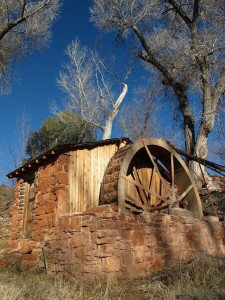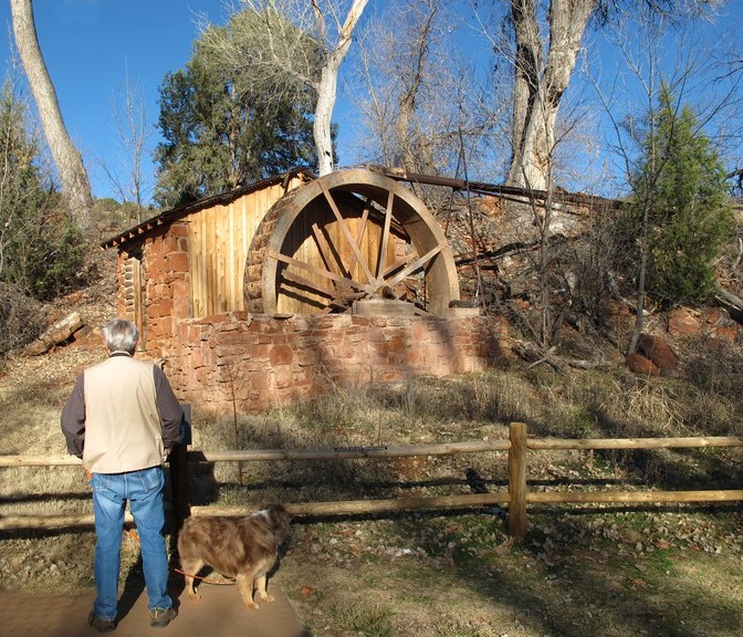 Wednesday, January 26 – It is Gregg’s birthday today. Hope you have a good one, too. Here are some shots I think you would appreciate. This is an old water wheel for generating electricity and pumping water that we saw down at Red Rock Crossing. I know you like anything historic and this certainly was. Even Shep seemed interested, as you can see. He has been amazingly good on all our hikes and outings.