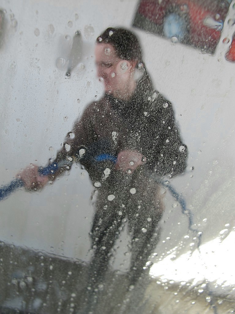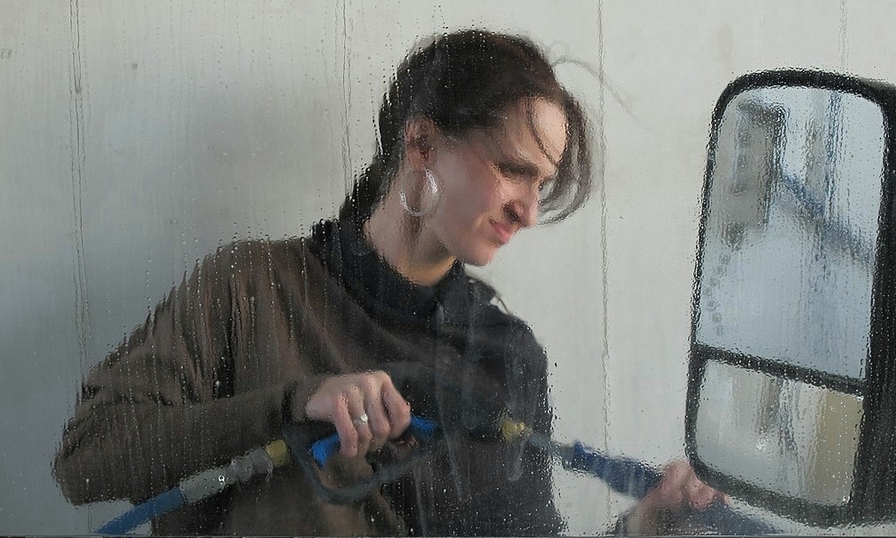 Wednesday, March 23 – Tiffany and I went shopping yesterday before having dinner and  attending the Pioneer Woman with Leslee and Kirsten. Bryant had requested washing his pickup which we found out wouldn’t fit through the auto wash because of the width of it’s wheels. Only option left, was to hand wash it. As you can see, she does a darn good job of being a truck washer. I liked the view I got from inside the cab.