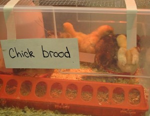 Tuesday, April 12 – Here is the batch of baby chicks that Billi hatched in her classroom a couple of weeks ago. They are heading to my house soon and a brand new chicken coop that we just purchased for them. Becca and Emma have all 10 of them already named. I know there is a Hercules, Yard Bird, Elvis, Giganto and Skittles. I better get the rest of the names down before they get here. They are eating like troopers and growing their adult feathers. I sure hope that I chose mostly hens. I think we have Speckled Sussex, Aracanas, Cochin, and mystery yellow ones, which might be Buff Orpington. The photo was pretty hard to take considering there is a red brooder light. Don’t you just love that sign?