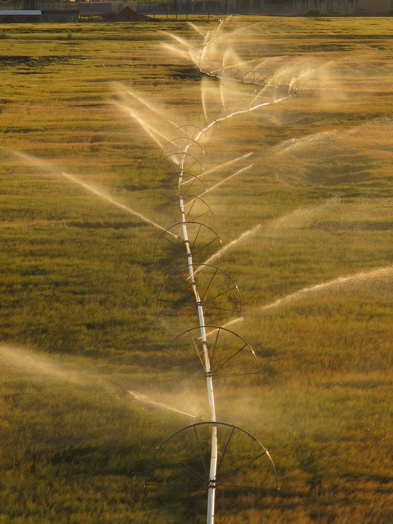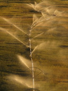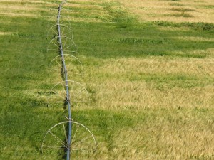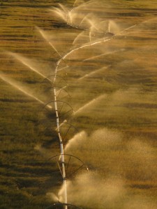 Sunday, August 14 – Doesn’t this look refreshing on a hot day? That wheat is sure appreciating the cool drink of water it is receiving. I am glad that we are dry land farmers and don’t have to contend with all the work that irrigation requires. It sure does produce wonderful crops though. The bottom picture is when the sprinklers were off and not in the golden evening light.