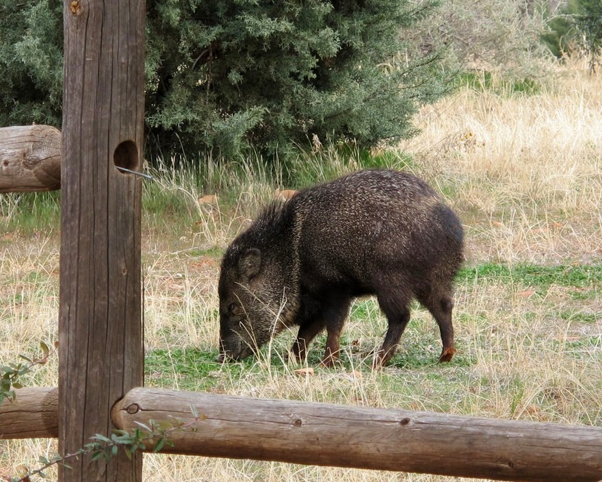 Monday, February 20 – After a cool drink of water in our pool, they moved on next door to nibble some greenery. Â Notice the sharp teeth in the one photo. I was mighty glad to have a fence between my camera and these little stinkers. I mean that literally, as they really smell awful. It is really greening up here with all the rain that we have had in the last few weeks. I see buds on the trees too. I used Walter’s G12 for these shots.