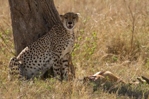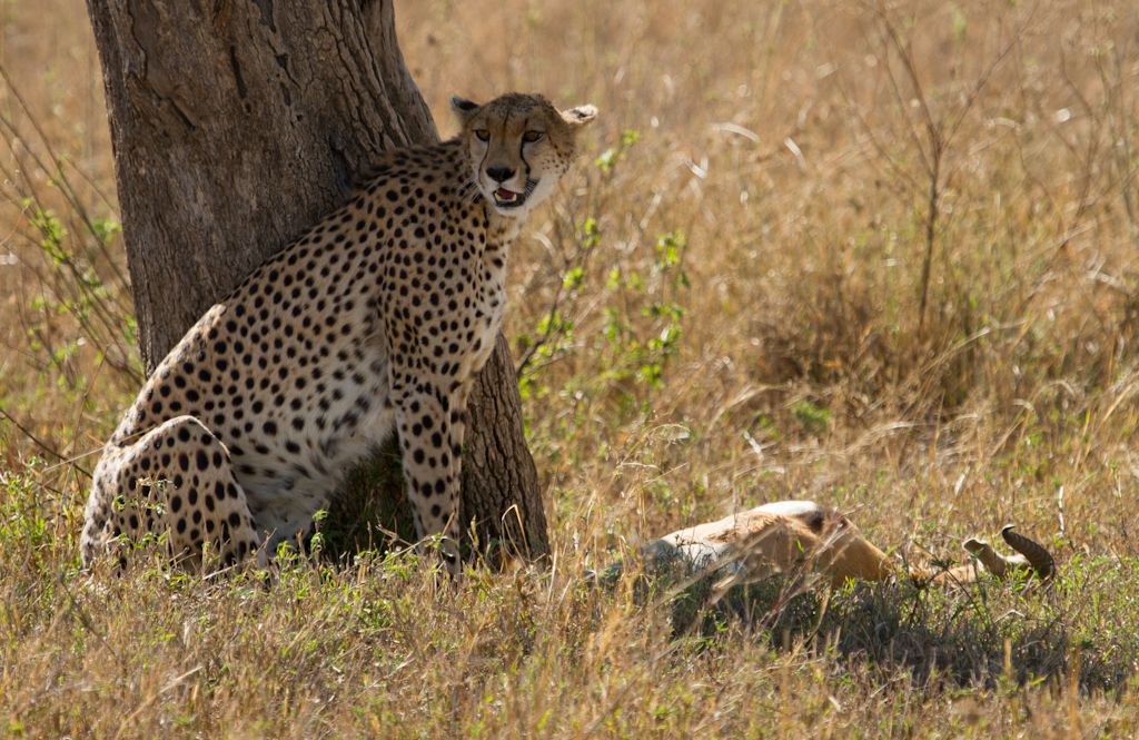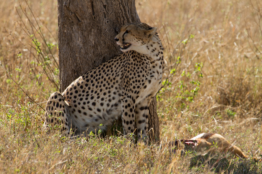 This Cheetah was guarding her morning catch. More to come with this beauty.Can you tell how you can easily tell a Cheetah from a Leopard? Check out the spots.