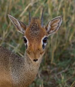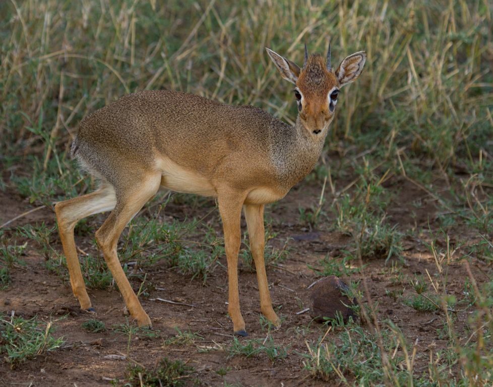 This small, delicate antelope is abundant in Tanzania. The female is larger than the male. They are around 18 inches tall and weigh about 12 pounds. That little face is so unique with the tiny nose. This little guy is definitely a male with the horns that only males have.
