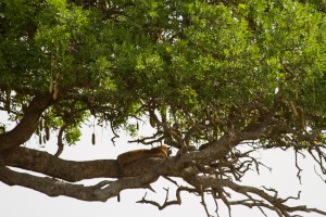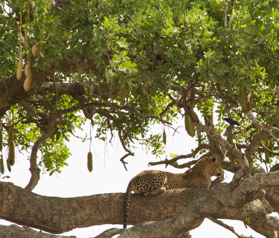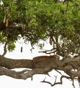 Mr. Leopard was taking a brief nap when our guide spotted him. He was off the road quite a distance, so the photo isn’t as good as I wished. But you get the idea. They are very hard to spot, I think, unless you are a guide and used to seeing them. That is a Sausage tree he is in. The fruits are really heavy and not edible.  I would  not want to be hit by one, for sure. I have more photos of leopards with prey yet to come.make sure to click on the photos to enlarge.